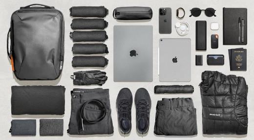 - Aer 超薄包。2020 年,我定制了一个 10L 包,但它不是很耐用,所以目前我又回到了科技包(MYOG 包 v2 即将推出)。这款包的容量为 9 升,可完美存放我所有的东西,但不包括远足装备,即使是最严格的廉价航空公司也完全符合“个人物品”尺寸要求。我永久地在里面放了一个 Airtag,并将一些 Nite Ize S-biners 连接到拉链头上,以锁定包以防止随意被盗。